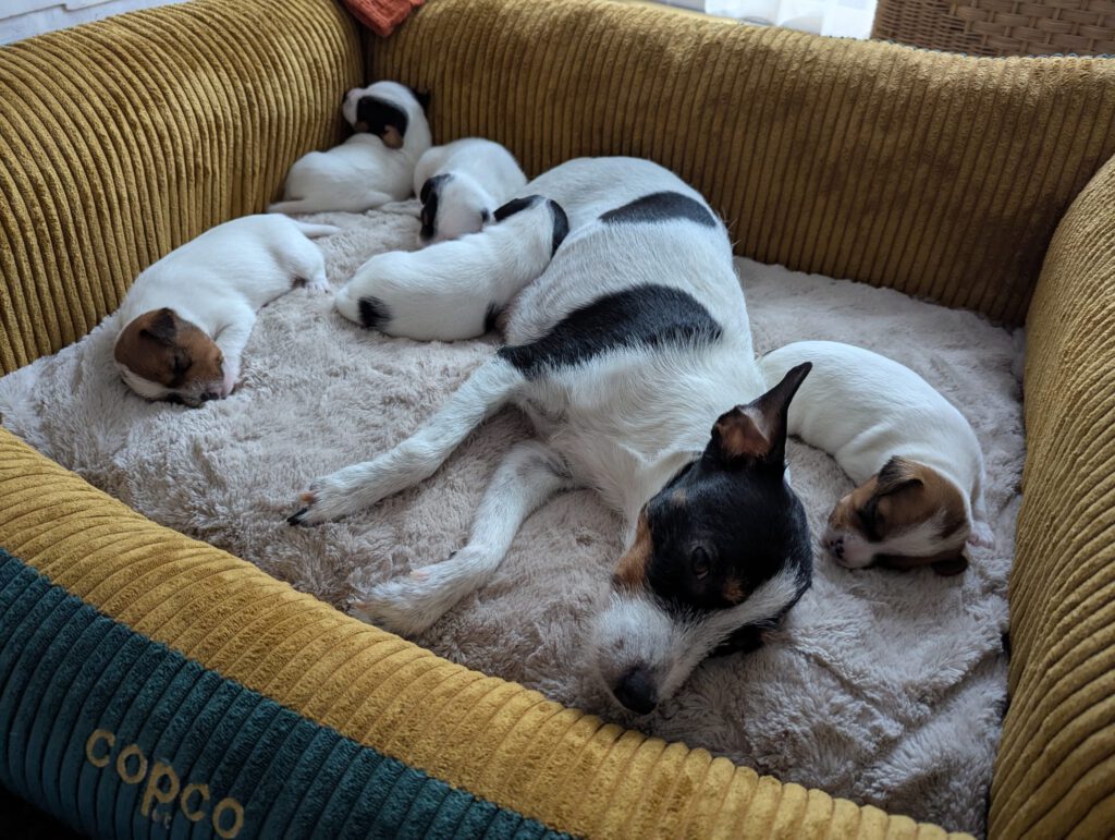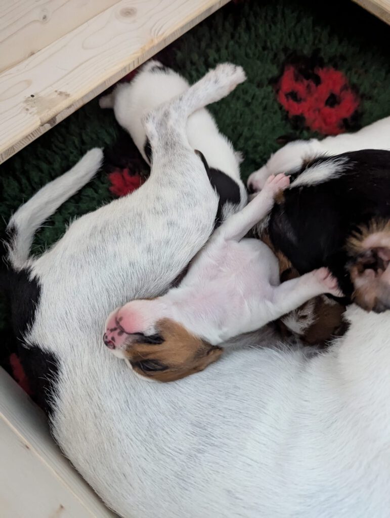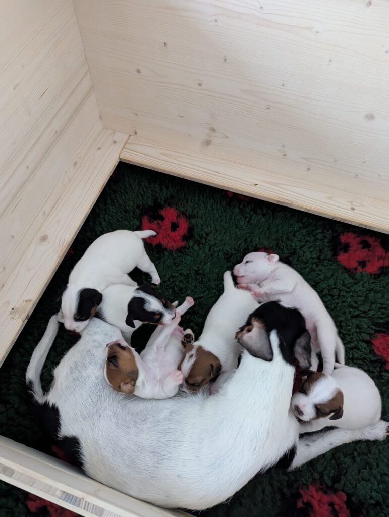 Unsere Welpen sind geboren 🙂 Am 07. April kamen 3 Rüden und 3 Hündinen zur Welt, alle fit und munter. Gundel versorgt ihre Babys vorbildlich…wir freuen und auf die nächsten Wochen mit ihnen 🙂